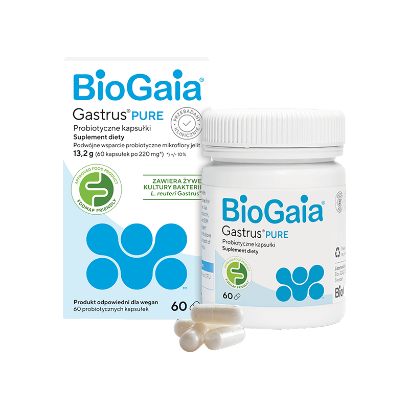 BioGaia Gastrus PURE to suplement diety, oparty na klinicznie przebadanych probiotycznych szczepach L. reuteri, które wspomagają równowagę mikroflory jelitowej i korzystnie wpływają na zdrowie przewodu pokarmowego.